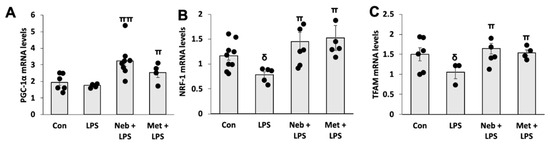 Figure 3. Effects of Neb and Met on LPS-stimulated gene expression related to mitochondrial biogenesis in H9c2 cells. mRNA levels of PGC-1α (A), NRF1 (B), and TFAM (C) were upregulated by both Neb and Met. δ p < 0.05 vs. Con, ππ p < 0.02, π p < 0.05 vs. LPS. Values are presented as means ± SEM N ≥ 6 for each treatment group.