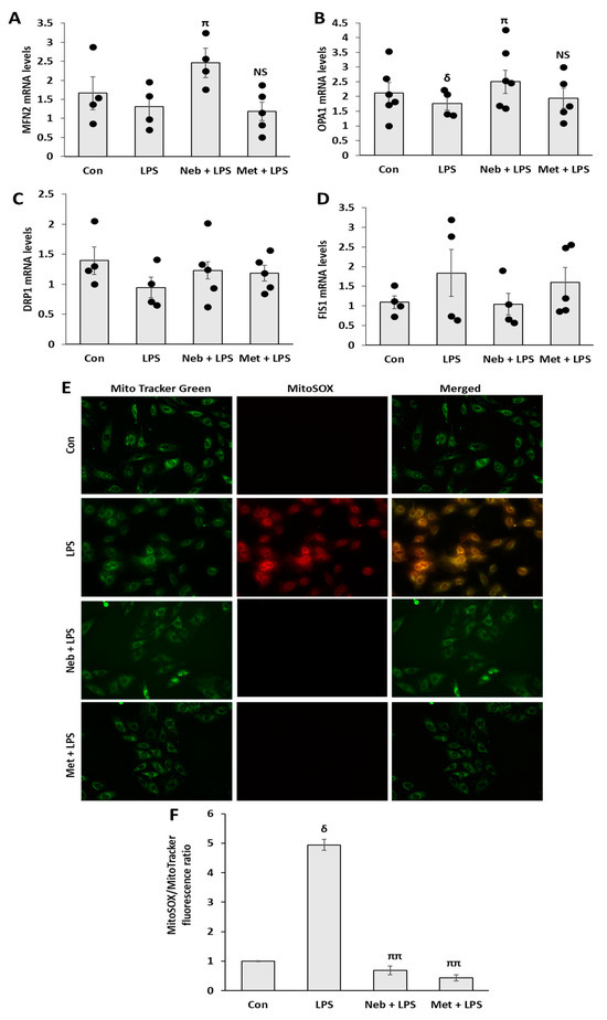Figure 4. Effects of Neb and Met on mitochondrial dynamics and generation of mitochondrial ROS in H9c2 cells. Expression of genes associated with fusion MFN2 (A), OPA1 (B), and fission DRP1 (C) and FIS1 (D). (E) Representative images of H9c2 cells stained with MitoTracker Green and MitoSOX red. Increase in MitoSOX red fluoresence that co-localizes with MitoTracker Green, suggest an increase in mitochondrial ROS production in LPS treated cells. (F) Histogram showing the relative fluorescent intensity of MitoSOX red normalized to MitoTracker green. δ p < 0.05 vs. untreated (Con), ππ p < 0.02, π p < 0.05 vs. LPS and NS, nonsignificant vs. LPS. Values are presented as means ± SEM N ≥ 6 for each treatment group.