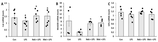 Figure 5. Effects of Neb and Met on antioxidant defense system in H9c2 cells. Expression of genes associated with cellular antioxidant defense system CAT (A), MnSOD (B) GPx (C). δ p < 0.05 vs. untreated (Con), π p < 0.05 vs. LPS.4.