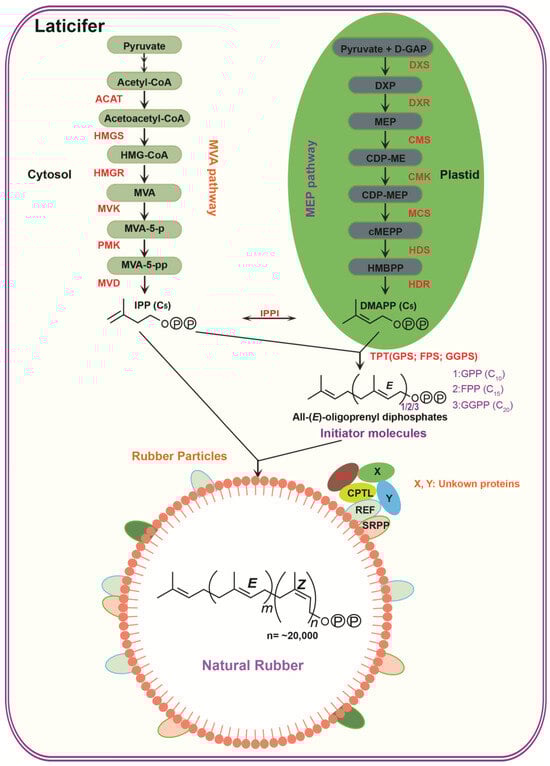 Subsequently, isopentenyl diphosphate isomerase (IPPI) catalyzes the conversion of a portion of IPP into DMAPP. The synthesis of initiator molecules such as geranyl pyrophosphate (GPP), farnesyl pyrophosphate (FPP), and geranylgeranyl pyrophosphate (GGPP) is generated through the consecutive condensation of IPP and DMAPP [8]. This condensation is catalyzed by a group of prenyl pyrophosphate synthase enzymes, including geranyl diphosphate synthase (GPS), farnesyl diphosphate synthase (FPS), and geranylgeranyl pyrophosphate synthase (GGPS). Finally, by sequentially condensing 15,000–30,000 IPPs on the initial molecules, a substantial chain of natural rubber with a high molecular weight is generated (Figure 1).