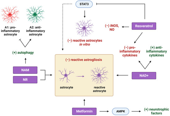 The effects of different CRMs on astrocytes. Resveratrol attenuates the expression of pro-inflammatory cytokines and inflammatory markers, such as iNOS and NO, while it also downregulates STAT3 signaling, leading to reduced proliferation and activation of reactive astrocytes. Given that STAT3 is implicated in the formation of glial scars in response to CNS demyelination, it is possible that resveratrol can reduce reactive astrogliosis in vivo. Furthermore, reduced reactive astrogliosis is observed upon NR, NAD+, NAM, and metformin treatments. NAD+ administration results in a decreased expression of pro-inflammatory cytokines and an increased expression of anti-inflammatory ones. In a similar way, NAM facilitates the polarization of astrocytes toward their anti-inflammatory phenotype, partially through the induction of autophagy. Metformin, in turn, acts through the activation of AMPK and induces the production of neurotrophic factors by astrocytes. This protective, less inflammatory microenvironment can support the process of remyelination in vivo after a demyelination insult. STAT3: signal transducer and activator of transcription 3; AMPK: adenosine 5′-monophosphate-activated protein kinase. Created with BioRender.com (accessed on 21 November 2023).