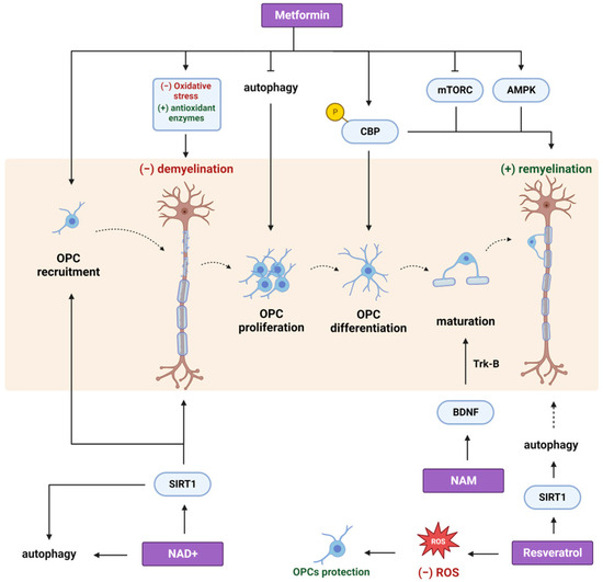 The effects of different CRMs on oligodendrocyte lineage cells and the process of remyelination. Metformin administration promotes the recruitment of OPCs to the lesion site and attenuates demyelination through its ability to reduce oxidative stress and upregulate antioxidant enzymes. Furthermore, metformin promotes OPC proliferation via the blockage of autophagy and enhances OPC differentiation and maturation into myelinating OLs via CBP phosphorylation. The remyelination process is also enhanced by the modulation of AMPK/mTORC pathways in mature OLs. Apart from metformin, NAM and resveratrol can promote the remyelination process. NAM treatment promotes the maturation of OPCs via the BDNF/TrkB pathway. Resveratrol protects OLs by reducing the abundance of ROS while it also induces autophagy through the activation of SIRT1, a mechanism that likely supports remyelination. Finally, direct NAD+ supplementation facilitates the recruitment of OPCs and alleviates demyelination through the activation of the SIRT1 signaling pathway and, probably, through the induction of autophagy. OPCs: oligodendrocyte progenitor cells; OLs: oligodendrocytes; CBP: CREB-binding protein; mTORC: mammalian target of rapamycin complex; BDNF: brain-derived neurotrophic factor; TrkB: tropomyosin receptor kinase B; SIRT1: sirtuin 1. Created with BioRender.com (accessed on 21 November 2023).
