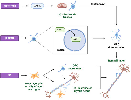 The effects of different CRMs on the aged central nervous system (CNS) after a demyelination insult. The administration of metformin improves the mitochondrial function of aged OPCs via the activation of AMPK, consequently facilitating the restoration of the CNS myelination, an effect that could be attributed to the induction of autophagy. Furthermore, β-NMN supplementation rescues SIRT2 nuclear localization in the OPCs of aged mice, thus enhancing remyelination by promoting the differentiation of aged OPCs. Finally, NA promotes remyelination by enhancing the phagocyting activity of middle-aged microglia. This process results in the removal of myelin debris from the lesion site and the recruitment and maturation of OPCs into myelinating OLs. β-NMN: β-nicotinamide mononucleotide; SIRT2: sirtuin 2; NA: nicotinic acid. Created with BioRender.com (accessed on 21 November 2023).