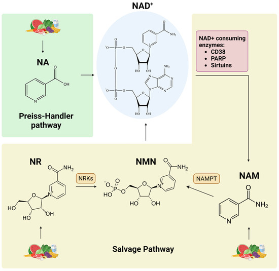 NAD+ biosynthetic pathways. NA is converted to NAD+ via the Preiss–Handler pathway, whereas NAM and NR enter the salvage pathway to produce NAD+. The NAD+ salvage pathway recycles NAM that is generated as a byproduct of the activity of NAD+-consuming enzymes: CD38, PARP, and sirtuins. NMN is synthesized from NAM by NAMPT as well as from NR by NRKs. PARP: poly (ADP-ribose) polymerase; NMN: nicotinamide mononucleotide; NAMPT: nicotinamide phosphoribosyltransferase; NRKs: nicotinamide riboside kinases. Created with BioRender.com (accessed on 21 November 2023).