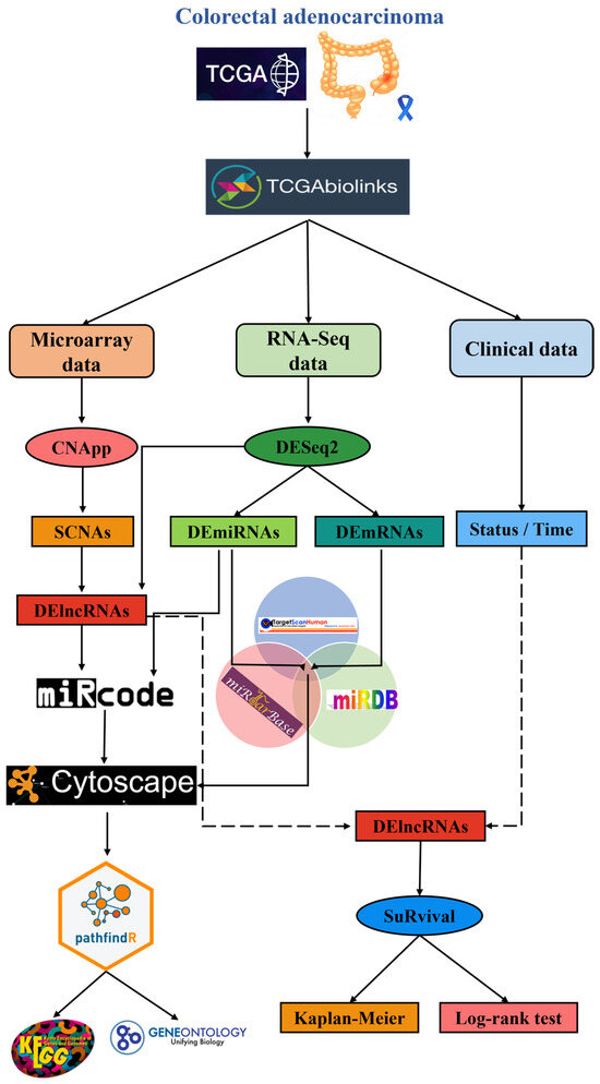To identify the differentially expressed long non-coding RNAs (DElncRNAs) coded in genomic regions with somatic copy number alterations (SCNAs) that arose during tumor progression in the colorectal cancer (CRC) patient samples and the effect they had on gene expression regulation, we proposed a bioinformatics workflow that used several data mining methods associated with the R programing (4.1.1) language and the Bioconductor (3.13) environment [27]. This workflow is outlined in Figure 1.