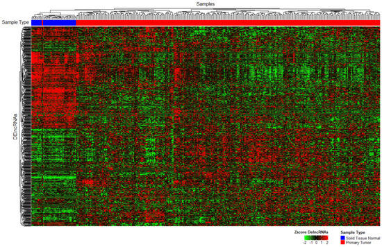Next, we wanted to study the patterns of differentially expressed genes between the tumor and healthy samples. For this purpose, we took the raw-count lncRNA matrix and used the variance stabilizing transformation from the DESeq package to normalize our dataset. Afterward, we calculated the Z score per gene and used the Complex Heatmap package [32] to draw the expression heatmaps.