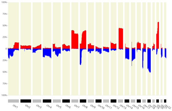 The x-axis shows the chromosomes, and the y-axis depicts the percentage of patients with the amplification/deletion feature. In blue we can see deletions and in red amplifications (p < 0.05).