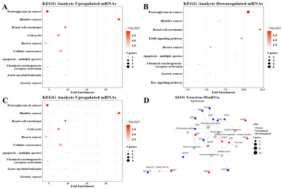 KEGG pathway enrichment analysis. (A) Upregulated mRNAs, (B) downregulated mRNAs, (C) all DEmRNAs, (D) term–gene graph. Number of genes altered per pathway and their fold enrichment; the graphs show the top ten processes observed in the analysis.