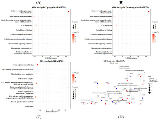 Gene ontology analysis. (A) Upregulated mRNAs, (B) downregulated mRNAs, (C) all DEmRNAs, (D) term–gene graph. Number of genes altered per pathway and their respective fold enrichment.