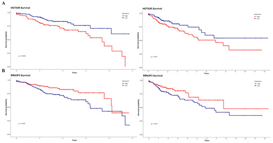 DElncRNA-associated survival curves up to 5 and 11 years. High HOTAIR expression (A) was associated with lower overall survival (p = 0.0052, p = 0.039) and a higher hazard ratio (p = 0.006, p = 0.0041). Lower RRN3P3 expression (B) was associated with lower overall survival (p = 0.019, p = 0.053) and a higher HR (p = 0.021; p = 0.056).