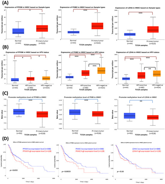 The results of the analysis of phosphofructokinase M (PFKM), pyruvate kinase M2 (PKM2), and lactate dehydrogenase A (LDHA) gene expression data available from the Cancer Genome Atlas using the UALCAN tool. (A) The differences in the level of gene expression between normal tissue and HNSCC samples. (B) The differences in the gene expression level depending on HPV status. (C) The differences in gene promoter methylation level between normal tissue and HNSCC samples. The Beta value indicates the level of DNA methylation ranging from 0 (unmethylated) to 1 (fully methylated). (D) Kaplan–Meier plots showing the association between high and low expression levels of glycolytic-related genes and survival time of HNSCC patients. The asterisk (*) denotes statistically significant changes, * p < 0.05, ** p < 0.01, *** p < 0.001.