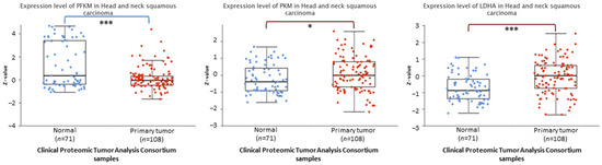 The results of the analysis of phosphofructokinase M (PFKM), pyruvate kinase M (PKM), and lactate dehydrogenase A (LDHA) protein expression data based on Clinical Proteomic Tumor Analysis Consortium (CPTAC) HNSCC samples using the UALCAN tool. Z-values represent standard deviations from the median across samples for the cancer type. Log2 Spectral count ratio values from CPTAC were first normalized within each sample profile and then normalized across samples. The asterisk (*) denotes statistically significant changes, * p < 0.05, *** p < 0.001.