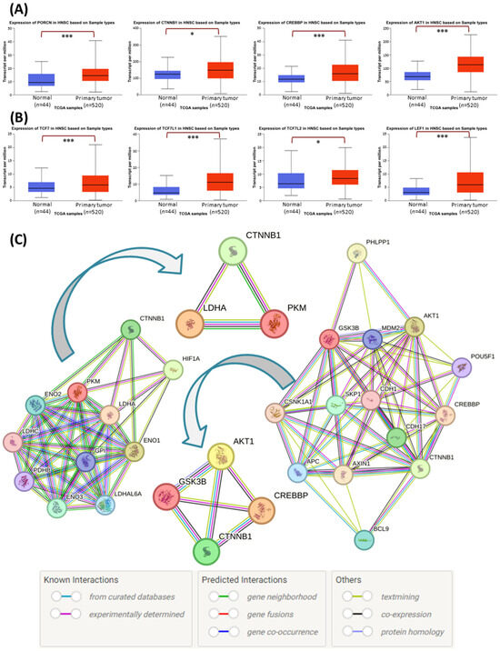 Analysis of Akt, Wnt signaling, and glycolytic pathway-related mRNA expression and functional protein–protein interactions. The results of the analysis based on data available from the Cancer Genome Atlas using the UALCAN tool showing the expression of: (A) genes being targets of small-molecule inhibitors used in the research, i.e., PORCN, CTNNB1, CREBBP, AKT1; (B) transcription factors responding to Wnt signaling activation, i.e., TCF7, TCF7L1, TCFTL2, LEF1. The asterisk (*) denotes statistically significant changes, * p < 0.05, *** p < 0.001. (C) The analyses of protein–protein interaction data available from the STRING database from the STRING CONSORTIUM 2023. The STRING graphs show the interaction of Wnt signaling elements with the Akt kinase and glycolysis proteins. Most important abbreviations: AKT1—Akt kinase 1, CREBBP—CREB binding protein, CTNNB1—β-catenin, GSK3B—glycogen synthase kinase 3β, LDHA—lactate dehydrogenase A, PKM—pyruvate kinase M, PORCN—porcupine.
