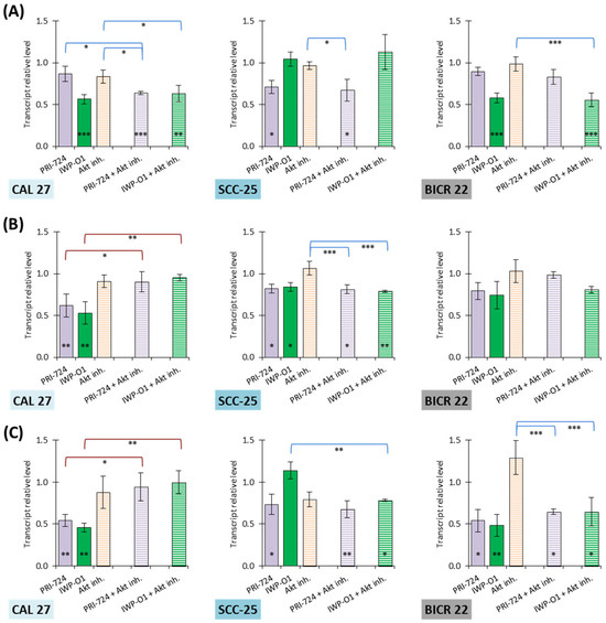 The effect of PRI-724, IWP-O1, and the Akt inhibitor on the relative transcript level of (A) phosphofructokinase M (PFKM), (B) pyruvate kinase M2 (PKM2), and (C) lactate dehydrogenase A (LDHA) in CAL 27, SCC-25, and BICR 22 cells. Mean values ± SD from three independent experiments with three replicates per qR-T PCR reaction are shown. The level of transcript in DMSO-treated cells was considered to be 1. The asterisk (*) inside the bar denotes statistically significant changes in comparison to the control, and above the bars denotes statistically significant changes in comparison to indicated experimental variants; * p < 0.05, ** p < 0.01, *** p < 0.001.