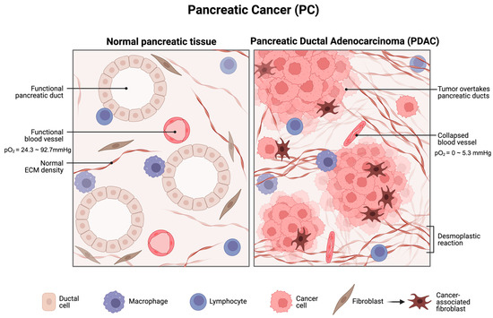 A schematic diagram for PC under profound hypoxia. PDAC displays intensive desmoplastic reaction, proliferation of PC cells, and, more importantly, collapsed blood vessels that significantly lower the oxygen pressure to 0 to 5.3 mmHg compared to 24.3 to 92.7 mmHg in normal pancreatic tissue. Created with BioRender.com (accessed on 10 November 2023).