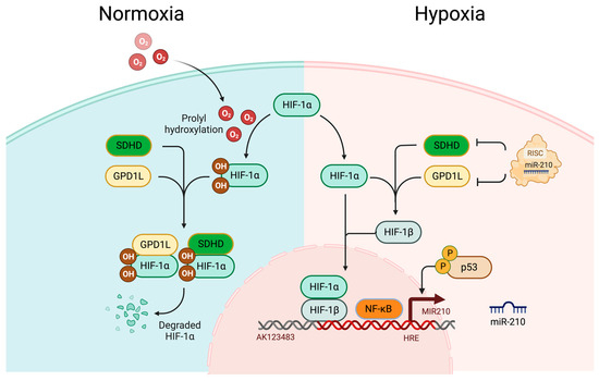 Hypoxia-induced miR-210 upregulation under HIF-dependent pathways and HIF-independent pathways. SDHD stands for Succinate Dehydrogenase Complex Subunit D; GPD1L for glycerol-3-phosphate dehydrogenase-like 1; HRE for Hypoxia Responsive Element. Host gene of miR-210, MIR210 is in the intron region of AK123483 non-coding RNA. Under normoxic conditions, HIF-1α is degraded by interacting with GPD1L and SDHD, while it is stabilised under hypoxic condition by miR-210 through inhibiting GPD1L and SDHD. HIF-independent pathways involve p53 and NF-κB. Hypoxic condition induces accumulation of p53 and NF-κB activation, which triggers miR-210 expression [46,47,53,54]. Created with BioRender.com (accessed on 10 November 2023).