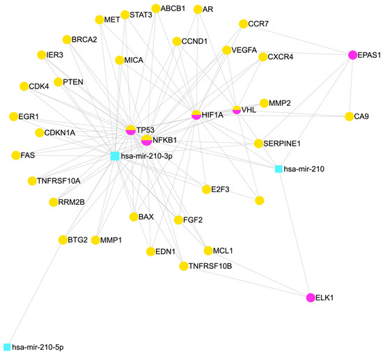 An interaction network to visualise the interaction of miR-210 and target genes. The pair-wise interaction is generated through miRNet (https://www.mirnet.ca/miRNet/home.xhtml) (accessed on 19 October 2023) [66]. Datasets are specialised to miRTarBase V8.0, miRecords, Transcription Factors. Organisms are specified as H. sapiens (human), and tissue type is not specified. Yellow nodes represent gene, pink nodes represent transcription factors, half yellow half pink are both genes and transcription factors while blue nodes used for miRNA. Edges represent the degree of interaction.