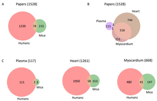 We found almost five times as many articles investigating humans as mice (Figure 1A). Many more articles were obtained for heart (n = 1261) and myocardium (n = 668) than for plasma (n = 117); most articles dealing with the myocardium also discuss the heart because the latter term includes the former, while overlap with plasma was minimal (Figure 1B). Regarding the three tissues and the two species, most plasma research was focused on humans (highlighting the use of human blood lipid levels as CVD biomarkers); research in mice was more biased towards myocardium than heart, but human research dominated both (Figure 1C).