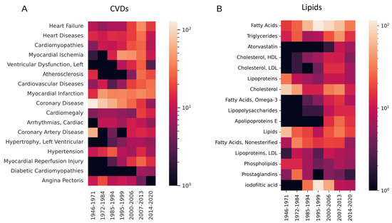 Evolution of usage of frequent MeSH CVD and lipid terms. (A) For CVD. (B) For lipids. The values represent numbers of articles using the term.