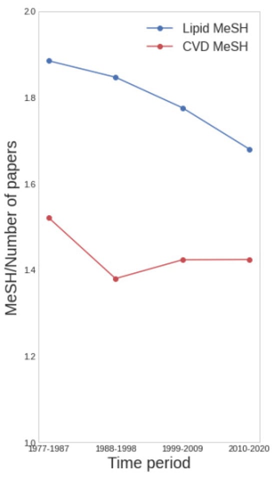 Average number of MeSH CVD and lipid terms per paper versus time. CVD MeSH terms per paper (red) and Lipid MeSH terms per paper (blue) in four different time periods.