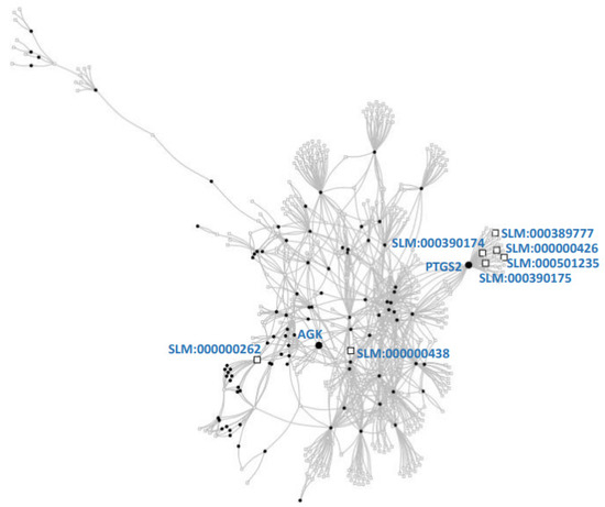 Protein–lipid network and top two proteins selected. The network represents proteins (squares) connected to lipids (dots) that they metabolize or transport. Literature lipids (large squares; Supplementary Table S6) were used to score proteins connected to them: prostaglandin G/H synthase 2 (PTGS2; UniProt:P35354) and acylglycerol kinase (AGK; UniProt:Q53H12) were the two most connected proteins (large dots). See Table 2 for other highly scored proteins (the full list is available as Supplementary Table S7). See text and Methods for details.