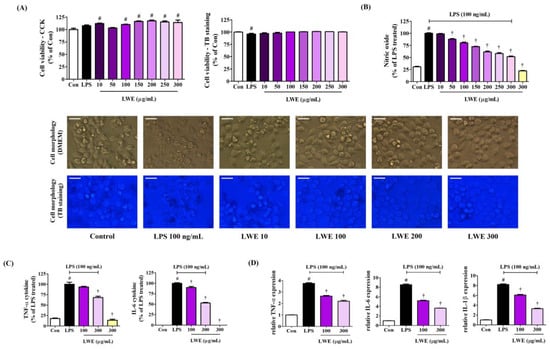 We first examined the influence of LWE on the viability of BV2 mouse microglia using the CCK solution. Exposure to LWE concentrations up to 300 μg/mL for 24 h did not reduce viable cell number compared to untreated control cultures (Figure 1A). Moreover, we cross-validated cell viability through TB staining to reliably rule out the potential cytotoxicity of LWE, and as with the CCK results, viability was similar to that of the control cells at all concentrations (Figure 1A). In addition, when observing cells in the culture medium and cells stained with TB, treatment with LWE had no significant effect on the morphology of BV2 cells at any concentration (Figure 1A). Thus, LWE concentrations from 10 to 300 μg/mL were examined for anti-neuroinflammation activities. Additionally, when treated with 100 ng/mL LPS alone, the survival rate of BV2 microglial cells changed only slightly, but the morphology of the cell line observed through microscope showed a significant change due to stimulation by LPS.