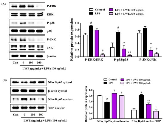 Effects of LWE on (A) the phosphorylation of MAPK and (B) the nuclear translocation of NF-κB p65. After LWE pretreatment at concentrations of 100 or 300 μg/mL, BV2 cells were stimulated with 100 ng/mL of LPS. Control cells were incubated with the vehicle alone. Blot images represent three independent experiments. Data are presented as mean ± standard error of the mean. # p < 0.05 vs. control; * p < 0.05, ** p < 0.01, and † p < 0.001 vs. LPS.