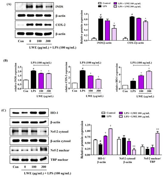 Effects of LWE on (A) the protein expression of iNOS and COX-2, (B) the mRNA expression of iNOS, COX-2, and HO-1, and (C) the nuclear translocation of Nrf-2 and protein expression of HO-1. After LWE pretreatment at concentrations of 100 or 300 μg/mL, BV2 cells were stimulated with 100 ng/mL of LPS. (B) RT-qPCR results are presented from six independent experiments. Control cells were incubated with the vehicle alone. Blot images represent three independent experiments. Data are presented as mean ± standard error of the mean. # p < 0.05 vs. control; * p < 0.05, ** p < 0.01, and † p < 0.001 vs. LPS.