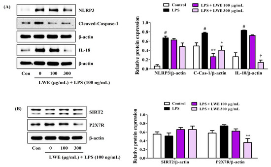 We next investigated whether the anti-neuroinflammatory activity of LWE is associated with inhibition of the NLRP3 inflammasome. Indeed, Western blot analysis revealed that LWE effectively inhibited LPS-induced upregulation of NLRP3, cleaved-caspase-1, and IL-18 proteins (Figure 4A). In addition, SIRT2, an enzyme known to inhibit NLRP3 activity, was very slightly reduced by LPS treatment and slightly recovered by LWE pretreatment, but no significant changes were observed (Figure 4B). Pretreatment with LWE also reversed the LPS-induced upregulation of P2X7, a known promoter of NLRP3 activation (Figure 4B).