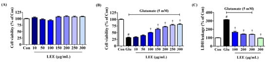 Effects of LEE on glutamate-induced cytotoxicity in HT22 cells. (A) HT22 cells were incubated with LEE concentrations of 10–300 μg/mL. (B,C) After LEE pretreatment at concentrations of 10–300 μg/mL, HT22 cells were exposed to 5 mM of glutamate. Control cells were incubated with the vehicle alone. Data are presented as mean ± standard error of the mean. # p < 0.05 vs. control; † p < 0.001 vs. glutamate.