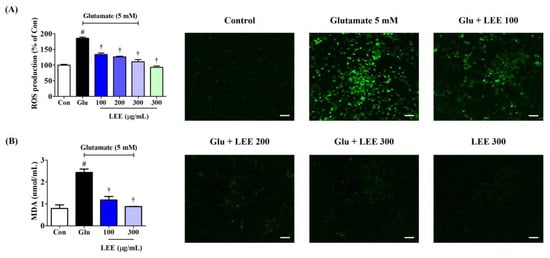 Effects of LEE against glutamate-induced (A) intracellular ROS production and (B) MDA expression in HT22 cells. Cells were pretreated with LEE concentrations of 10–300 μg/mL and then with 5 mM of glutamate. (A) H2DCFDA (20 μM) is an oxidation-sensitive fluorescence dye used to assess ROS levels. The ROS production was determined using a fluorescence microplate reader and a fluorescence microscope. Scale bar = 200 μm. (B) Levels of MDA were measured using a Lipid Peroxidation Assay kit. Control cells were incubated with the vehicle alone. All experiments were repeated at least three times, and similar results were obtained. Data are presented as mean ± standard error of the mean. # p < 0.05 vs. control; † p < 0.001 vs. glutamate.