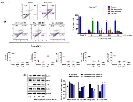Effects of LEE on glutamate-induced apoptosis in HT22 cells. Cells were pretreated with LEE at concentrations of 100–300 μg/mL and then treated with 5 mM glutamate. (A) Apoptosis of HT22 cells was evaluated using flow cytometry. The image on the top right shows the percentage of healthy, early apoptotic, late apoptotic, and necrotic cells for each treatment group. The dot plot images in the middle represents the percentage of healthy, early apoptotic, late apoptotic, and necrotic cells for each treatment group in three independent experiments. (B) The expression levels of BAX, Bcl-2, AIF, and PARP were determined by Western blot analysis. Control cells were incubated with the vehicle alone. All experiments were repeated at least three times, and similar results were obtained. Data are presented as mean ± standard error of the mean. # p < 0.05 vs. control; * p < 0.05, ** p < 0.01, and † p < 0.001 vs. glutamate.