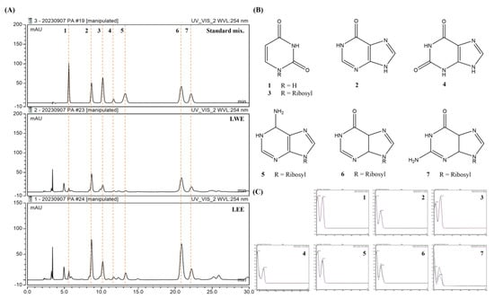 We selected seven standard compounds to assess the compositions of these extracts using HPLC (Figure 8A), and subsequently detected all seven in both LWE and LEE samples based on retention times and UV spectra (Figure 8B,C): uracil (1), hypoxanthine (2), uridine (3), xanthine (4), adenosine (5), inosine (6), and guanosine (7).