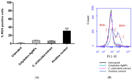 (A) shows the effects of Cotyledon-AgNPs (2.5 µg/mL) and C. orbiculata extract (15 µg/mL) on ROS levels in KMST-6 cells. (B) shows an example of a histogram plot of CM-H2DCFDA probe fluorescence that was generated by flow cytometry for KMST-6 cells. Indicated in the histogram are populations that are positive (ROS+) and negative for (ROS−) for CM-H2DCFDA fluorescence. Each value represents mean ± standard error of the mean (SEM, n = 3); statistical significance of the C. orbiculata extract- and Cotyledon-AgNPs-treated cells when compared with the untreated cells is indicated with *** for p <0.001.
