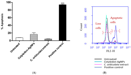 (A) shows the apoptotic effects of Cotyledon-AgNPs (2.5 µg/mL) and C. orbiculata extract (15 µg/mL) on KMST-6 cells. (B) shows an example of a histogram plot of cells stained with the APOPercentage dye and analysed for fluorescence by flow cytometry. The histogram indicates live cell populations (cells that did not take up the APOPercentage dye) and apoptotic cell populations (cells that are stained with the APOPercentage dye). Each value represents mean ± SEM (n = 3); statistical significance of the C. orbiculata extract- and Cotyledon-AgNPs-treated cells when compared with the untreated cells is indicated with *** p for <0.001.
