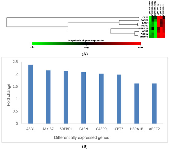 Studying the toxicity of nanomaterials using traditional bioassays was reported to have several disadvantages, which leads to irreplicable results [38]. The nanomaterials can interfere with the bioassay, which leads to unreliable results. However, gene expression analyses are considered one of the best ways to evaluate nanomaterial toxicity [22,39]. Therefore, in this study, gene expression studies were conducted to determine the molecular effects of Cotyledon-AgNPs on a non-cancerous skin fibroblast cell line, KMST-6. A molecular toxicity panel (Human Molecular Toxicology PathwayFinder RT2 Profiler PCR Array, Qiagen, Hilden, Germany) consisting of 84 genes was used for this analysis. Out of the eighty-four genes, eight (FASN, SREBF1, CPT2, ASB1, HSPA1B, ABCC2, CASP9, and MKI67) were differentially expressed in KMST-6 cells treated with 2.5 µg/mL Cotyledon-AgNPs for 24 h. All the differentially expressed genes that were upregulated are listed in Table 2 and in Figure 3 below. Their expression levels were between 1.5 and 2.5 times higher in the Cotyledon-AgNPs-treated cells when compared with untreated cells.