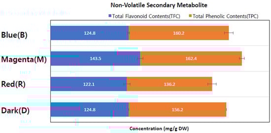 Figure 3, the M-LED-treated callus extract exhibited the highest TFC content among all four extract conditions, measuring 143.5 ± 5.2 mg/g. The TFC contents in the other light conditions ranged from 122 to 125 mg/g, which were 14.8% to 17.6% lower. Concerning total phenolic contents, M-LED yielded the highest value at 162.4 ± 7.2 mg/g, followed by B-LED with 160.2 ± 2.2 mg/g, D with 156.2 ± 6.7 mg/g, and R-LED with 136.2 ± 4.2 mg/g.