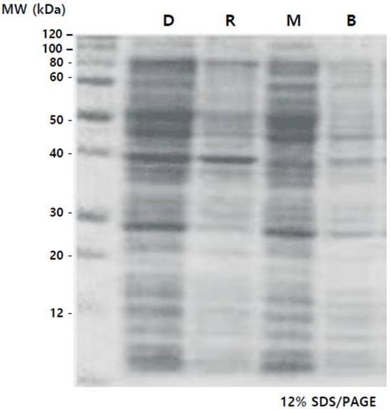 Figure 4. Elevated protein concentrations were observed in Lanes 1 (D) and 3 (M) compared to Lanes 2 (R) and 4 (B), especially in the 40 to 60 kDa range. In the case of M, it was observed that the 40 kDa protein, which was prominently present in D and R, was relatively less abundant. The plant group subjected to specific wavelength LEDs witnessed a rise in protein levels. Specifically, there was a notable increase in protein content under the mixed lights, and the color combination used in this study is the same as in previous reports [