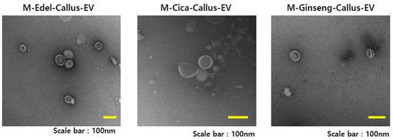 For the isolation and analysis of EVs, a liquid suspension culture was performed. Following a four-week culture period, separation of callus and cultured media was achieved using 100-mesh and 300-mesh filters, followed by centrifugation of the media at 3000~4000× g for 20 min with a centrifuge. Only the supernatant was collected to eliminate cell residues, and this step was repeated for thorough removal of impurities.