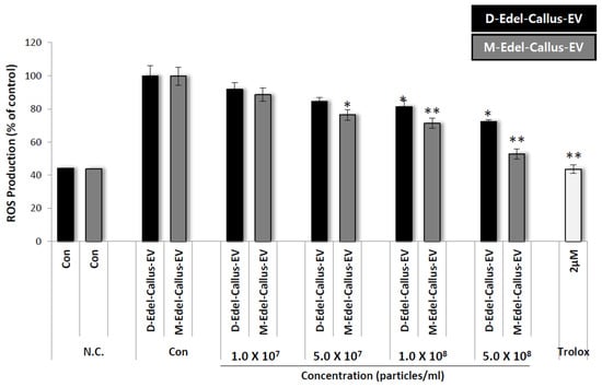 Figure 7 show that Edelweiss callus EVs cultured under M-LED treatment inhibit ROS production concentration-dependently, surpassing those from callus cultured in the dark. Despite both groups having the same particle number, the difference in efficacy is likely due to the simultaneous increase in active components according to LED irradiation. It is thought that differences in substances such as leontopodic acid explain the variation in efficacy when EVs are incorporated.