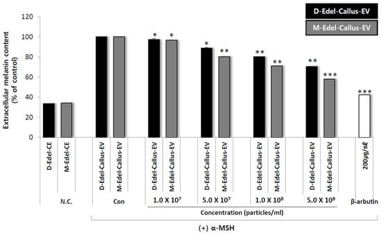 To assess the whitening effect, an experiment was conducted using callus EVs from Edelweiss cultured under both D (dark) and M-LED (magenta light-emitting diode) treatment conditions. B16F10 melanoma cells, derived from mice, were seeded into 24-well plates at a concentration of 3 × 104 cells per well using a DMEM medium. The cells were cultured for 24 h at 37 °C in a 5% CO2 environment. To induce melanin production, 50 nM of α-MSH was added to the cells cultured for 24 h.