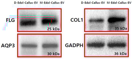 Figure 9, EVs derived from Edelweiss callus, cultured under magenta LED (M-LED) or darkness (D), were applied to fibroblasts and incubated for 24 h. Following treatment, intracellular proteins were extracted, and their concentration was measured. Subsequent steps included electrophoresis and transfer to a PVDF membrane. Antibodies targeting FLG, AQP3, and COL1 were employed to evaluate protein expression. Notably, M-Edel-CE, treated with combined light, exhibited higher expression, particularly with a more than five-fold increase in COL1, indicating a significant impact on key proteins associated with skin health. This observation aligns with previous findings related to antioxidants and melanin, suggesting that LED treatment effectively generates high-quality EVs with diverse anti-aging benefits.