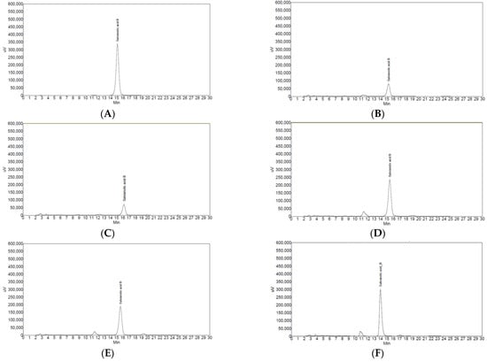 Results of high-performance liquid chromatography chromatogram for the salvianolic acid B in five types of Salviae mitiorrhizae Radix. (A) Standardized salvianolic acid B. (B) Salvianolic acid B in C1. (C) Salvianolic acid B in C2. (D) Salvianolic acid B in K1. (E) Salvianolic acid B in K2. (F) Salvianolic acid B in K3. K1, K2, and K3 showed high peak values similar to that of the standardized salvianolic acid B. C1 and C2 showed low peak values. C, Chinese Salviae miltiorrhizae Radix; K, Korean Salviae miltiorrhizae Radix.