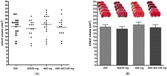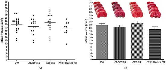The experimental drug A 60 mg/kg and BC2 30 mg/kg combination (A60+B(C2)30) was administered orally before pMCAO surgery to confirm its neuroprotective effect. DW, Aspirin® 30 mg/kg (ASA30), and drug A 60 mg/kg (A60) were also administered in the same manner as controls. The infarct volume was measured 24 h after pMCAO. The infarct volume in the group administered the experimental drug A+BC2 exhibited a decreasing tendency; however, there was no significant difference in infarct volume among groups (p = 0.2989) (Table 4 and Figure 3).