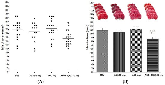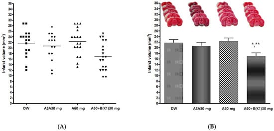 The experimental drug A 60 mg/kg and BK2 30 mg/kg combination (A60+B(K2)30) was administered orally before pMCAO surgery to confirm the neuroprotective effect. Distilled water (DW), Aspirin® 30 mg/kg (ASA30), and drug A 60 mg/kg (A60) were also administered in the same manner as controls. The infarct volume was measured 24 h after pMCAO. The group administered the experimental drug A+BK2 showed a significant decrease in infarct volume after pMCAO compared with other groups (p = 0.0072). Post-hoc analysis revealed that the group administered the experimental drug A+BK2 exhibited a significant decrease in infarct volume after pMCAO compared to the groups administered DW and A60 (p < 0.05 and p < 0.01, respectively) (Table 6 and Figure 5).