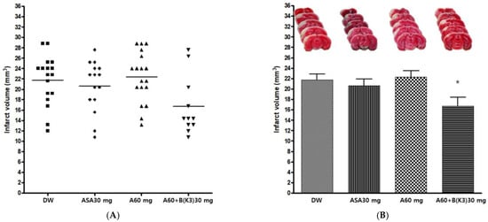 The experimental drug A 60 mg/kg and BK3 30 mg/kg combination (A60+B(K3)30) was administered orally before pMCAO surgery, to confirm the neuroprotective effect. Distilled water (DW), Aspirin® 30 mg/kg (ASA30), and drug A 60 mg/kg (A60) were also administered in the same manner as controls. The infarct volume was measured 24 h after pMCAO. The group administered the experimental drug A+BK3 showed a significant decrease in infarct volume after pMCAO compared with other groups (p = 0.0287). Post-hoc analysis revealed that the group administered the experimental drug A+BK3 exhibited a significant decrease in infarct volume after pMCAO compared to the A60 group (p < 0.05) (Table 7 and Figure 6).