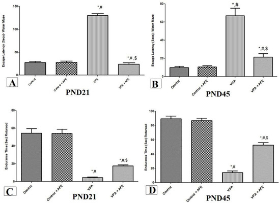 3.1. Effects of AFE on Spatial Memory Deficits and Motor Coordination in VPA-Induced Autism