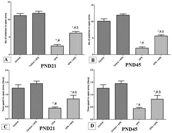3.2. Effects of AFE on Anxiety in VPA-Induced Autism