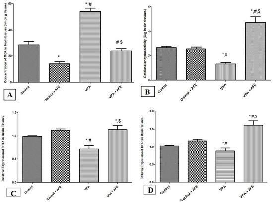 3.3. Effects of AFE on Oxidative Stress Markers (MDA and Catalase) and Expression of Nrf2 and HO-1 in VPA-Induced Autism