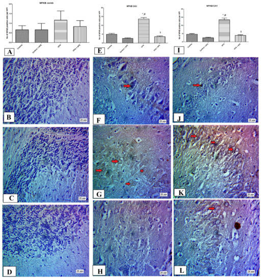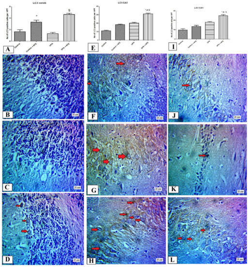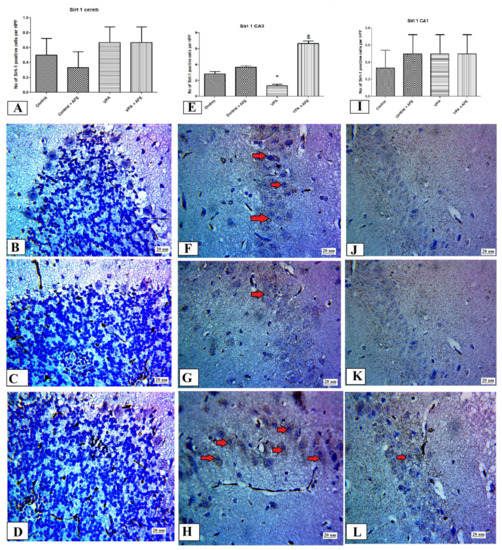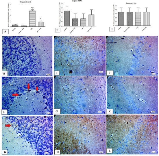 2.10. Immunohistochemical Examination for NF-κB, Caspase 3, and Sirt-1, and LC3 in CA3 and CA1 Regions of the Hippocampus and Cerebellum